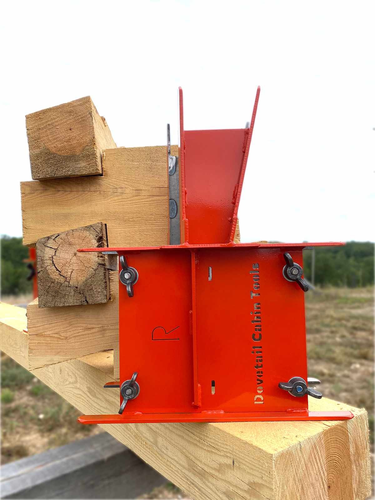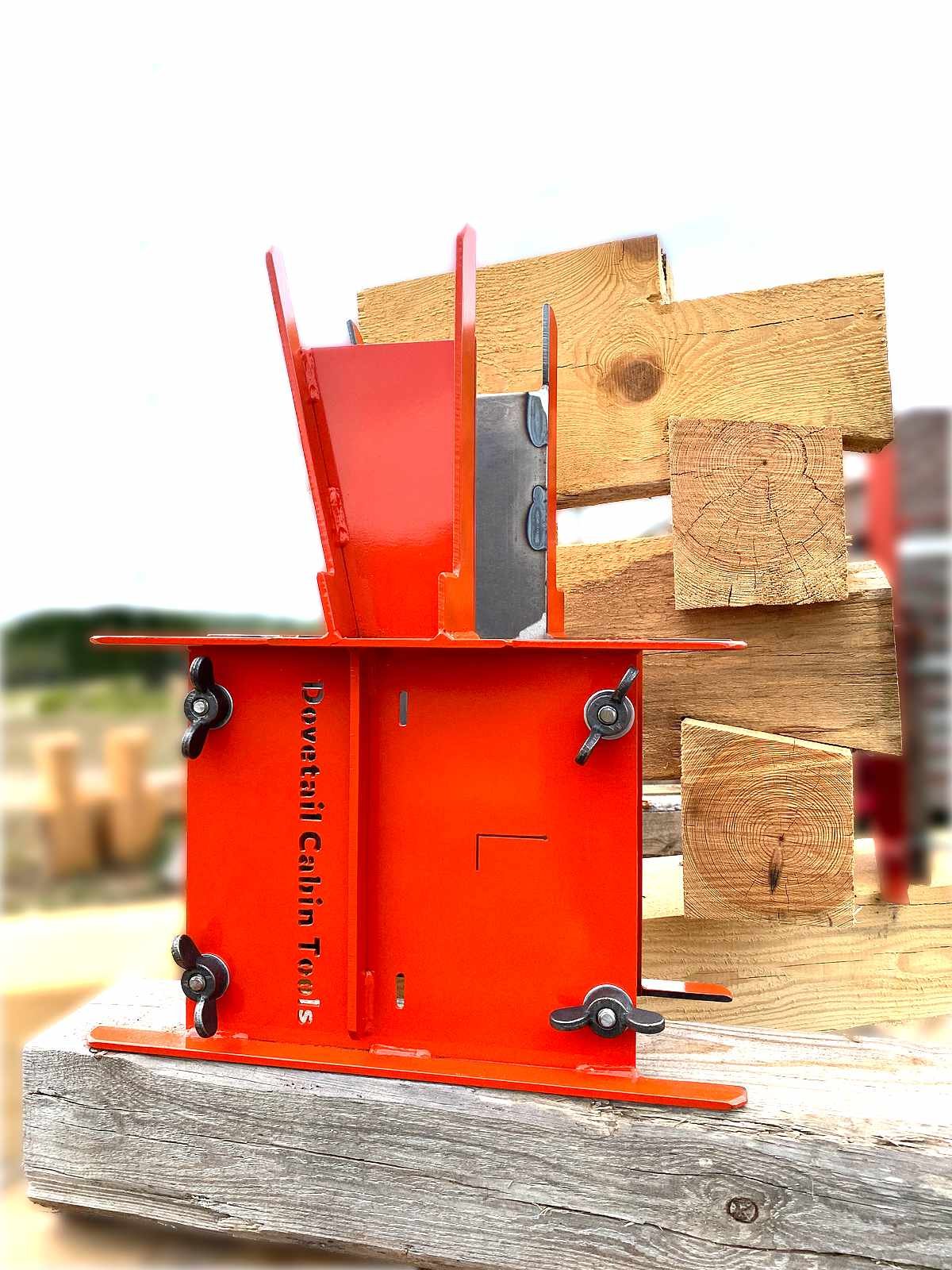 Dual-purpose: the bottom side is used to first make a perfectly straight end-cut, the jig is then refastened to the log to cut each side of the half dovetail joint with the top guides.